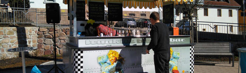 Einmalig in Südbaden ist unsere Trailerbar. Es handelt sich hierbei um einen ehemaligen Faltwohnwagen, der aufwändig zur mobilen Bar umgebaut wurde.